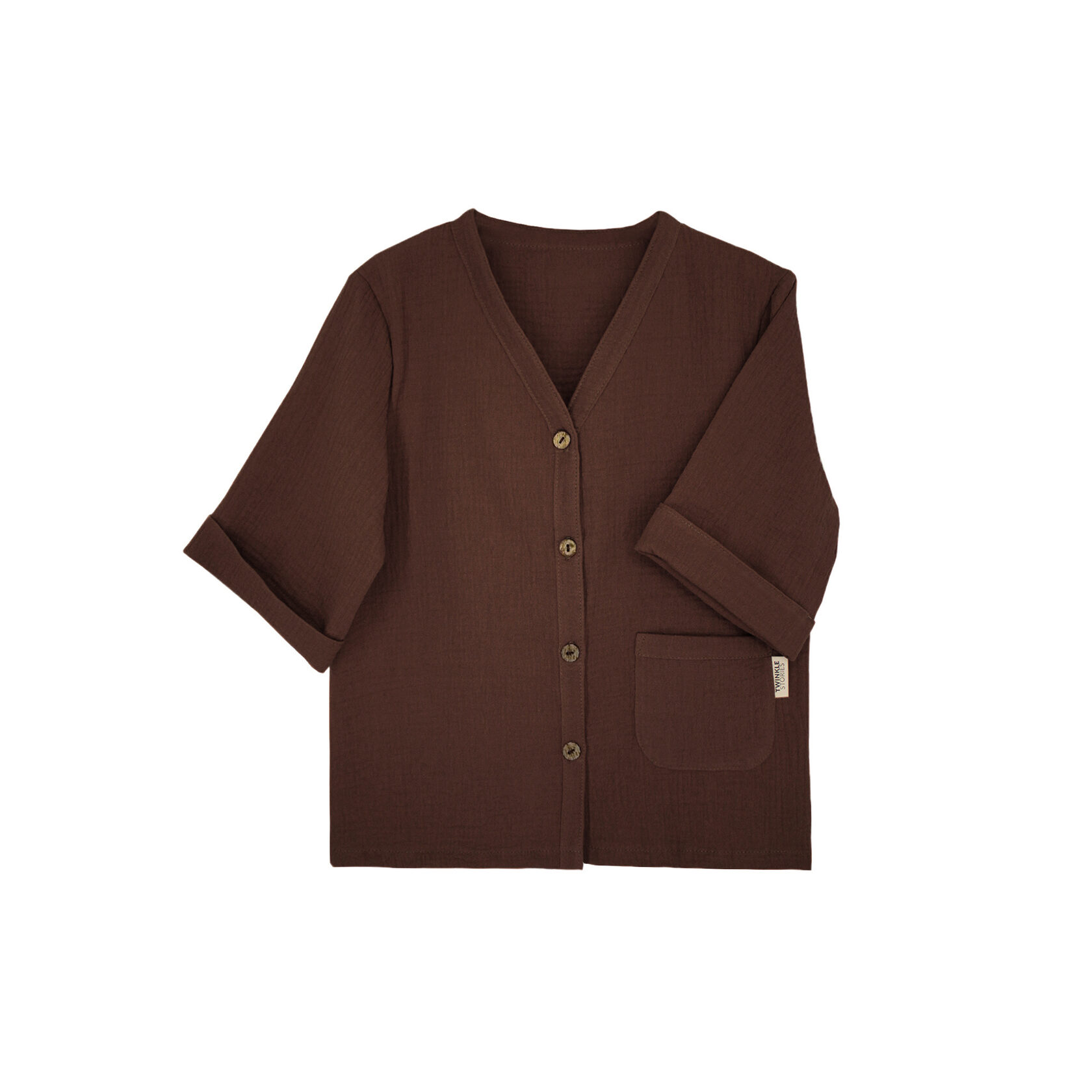 Рубашка из хлопкового муслина в шоколадном цвете. Свободный крой рукавов, кокосовые пуговицы.